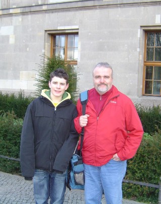 Um 5 Uhr hieß es aufstehen, denn um 7 Uhr fuhr der Bus am Bahnhof ab. Nach ca. 4 Stunden Fahrt konnte man Berlin sehen, was die meisten aber nicht taten da sie schliefen. Wir kamen an der damaligen Ost-West Grenzstation Dreilinden vorbei und sahen die Tribüne der ehemaligen Autorennbahn AVUS. Unser erster Stopp war das Holocaust Denkmal (das mit den vielen Betonstelen). Dort waren wir im Holocaustmuseum wo man Berichte, Bilder, Briefe, Tonaufzeichnungen und Daten über viele deportierte Menschen ansehen konnte. Wir erfuhren den Geburtsort und den Ort wo sie lebten als sie deportiert wurden mit Namen und Geburtsdatum. Eigentlich ein sehr trauriger Ort. Danach ging es in ein Restaurant in der Nähe des Brandenburger Tors wo wir erst einmal zu Mittag aßen. Dann konnten wir uns ein bisschen umschauen und trafen uns dann am Brandenburger Tor (Foto rechts). Von dort ging es zum Bundestag wo wir auf der Zuschauertribüne des Plenarsaals saßen und uns eine sehr freundliche Frau etwas über die Entstehung erzählte und auch Fragen beantwortete. Nun trafen wir uns mit Daniel Rühmkorf im Fraktionsraum der Linken der uns über die Ziele der Linken informierte und auch sehr ausführlich unsere Fragen beantwortete. Danach, es war leider schon dunkel, ging es zur begehbaren Kuppel des Reichstages, in der man einen tollen Ausblick hatte. Nun ging es zum Hotel, einem 5-Sterne Hotel wo wir zu Abend (super leckeres Buffet warm und kalt) aßen. Danach ging es entweder ins Bett oder man durfte noch eine kleine Spritztour mit den Betreuern machen.